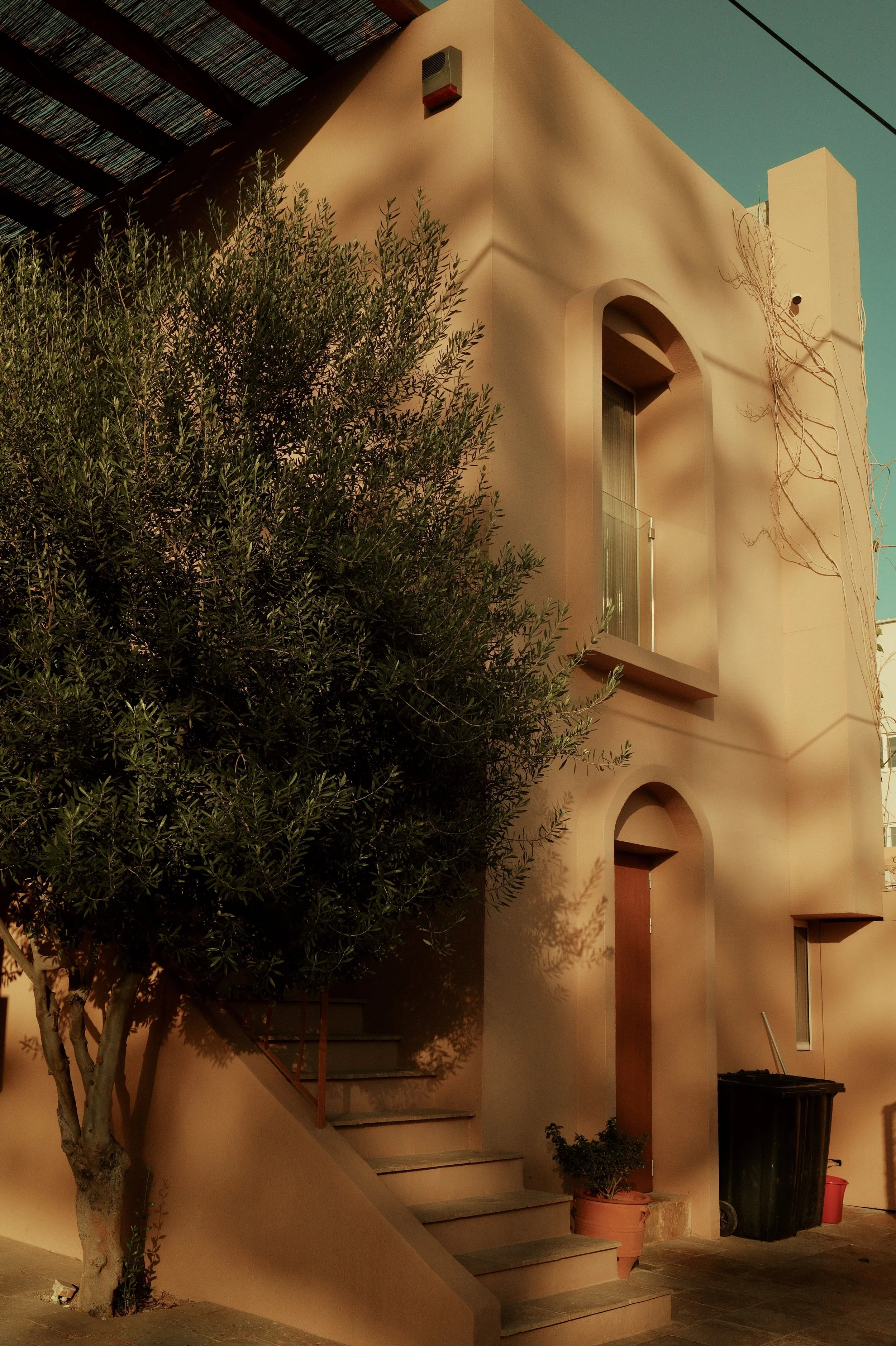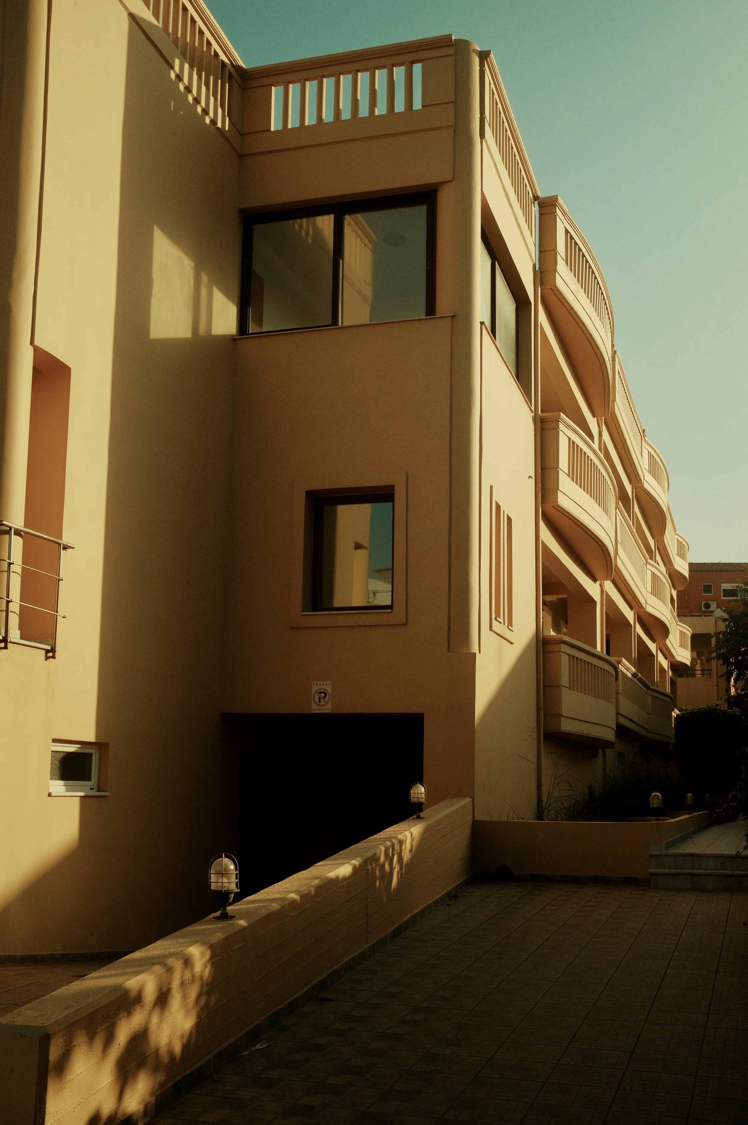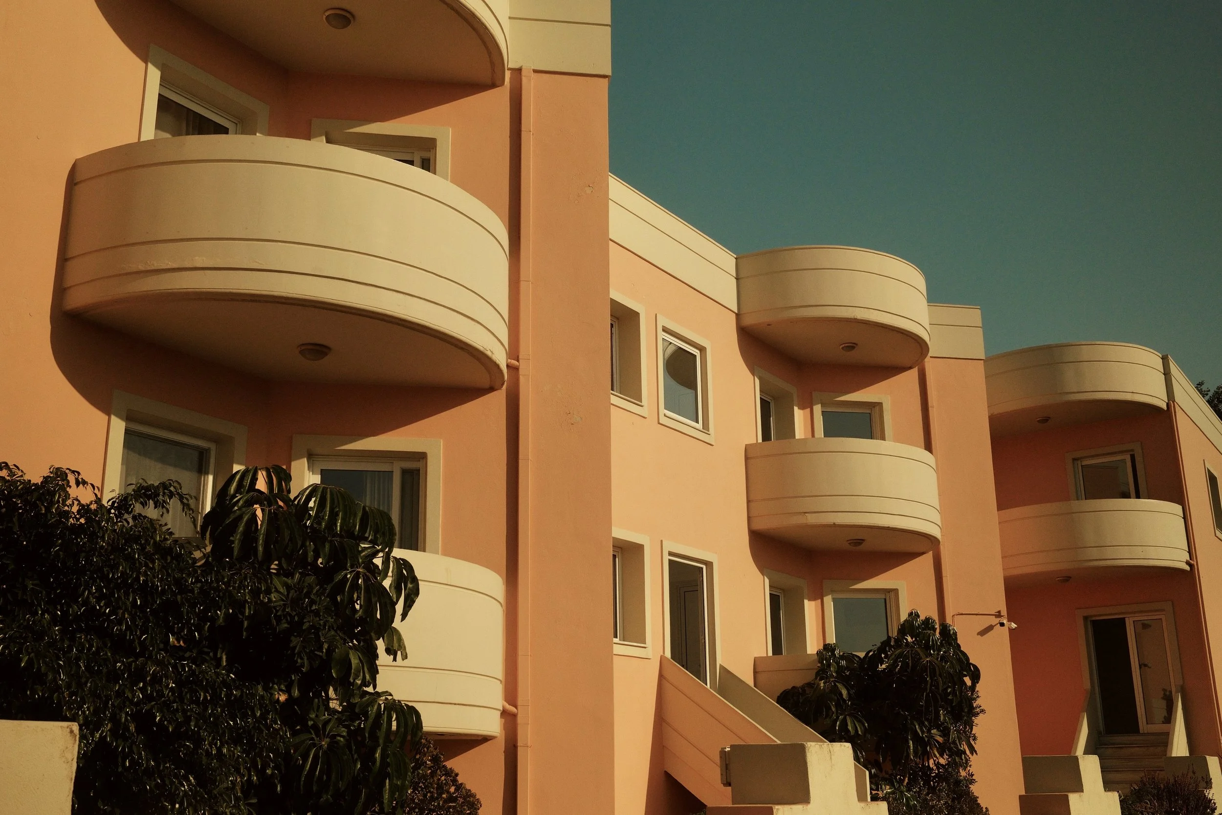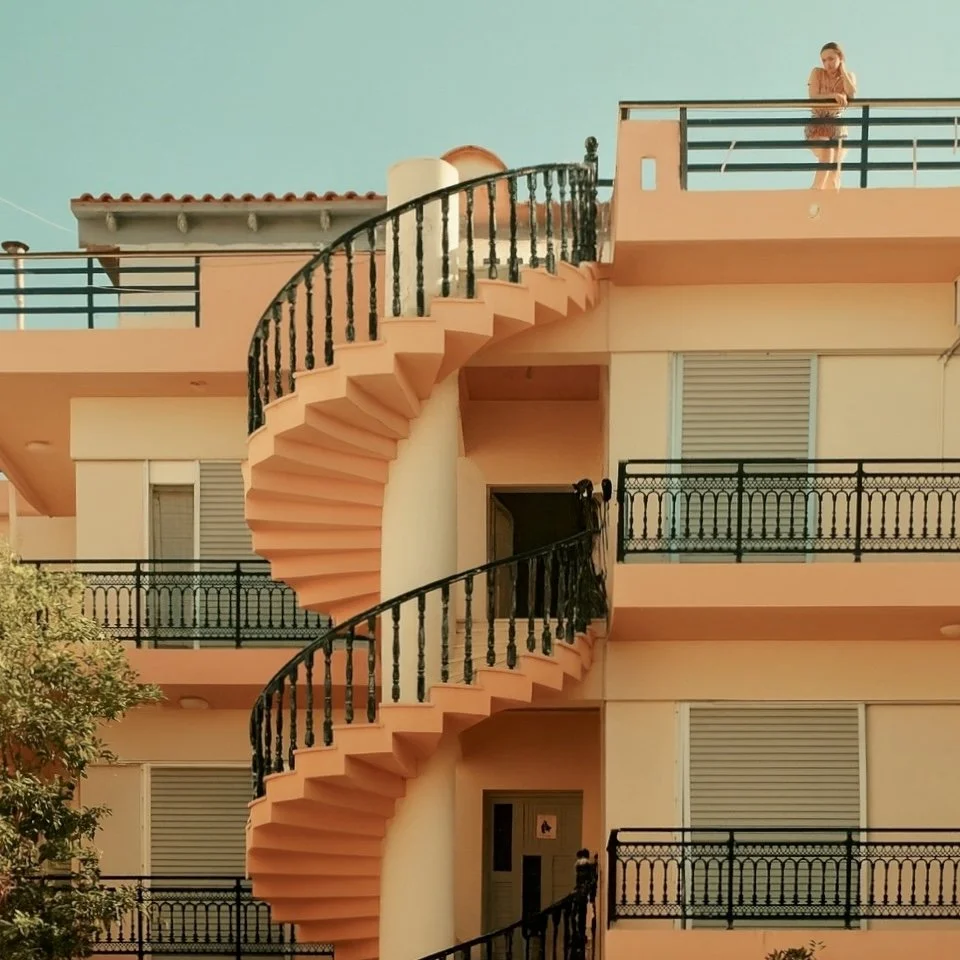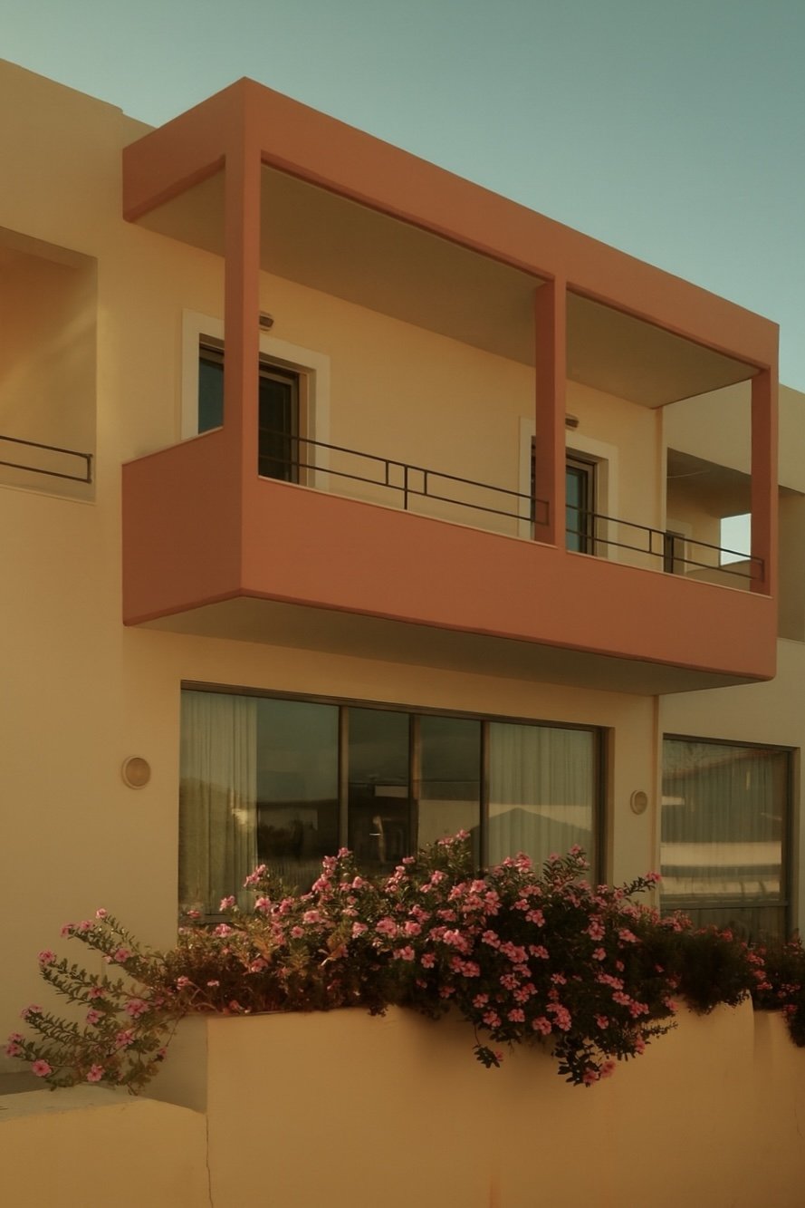 In Greece, the streets turn into a palette. Houses are washed in ochre, turquoise, and faded pink; shutters stand bright against whitewashed walls; balconies lean into the sky. Each building carries its own character, marked by colour and weather, by light and time.