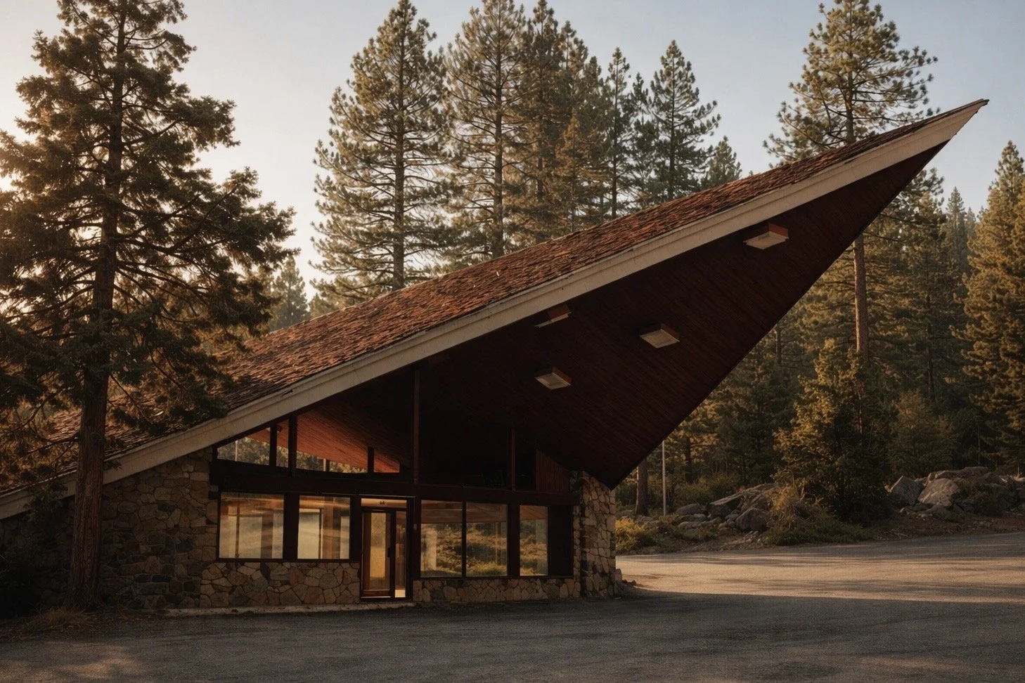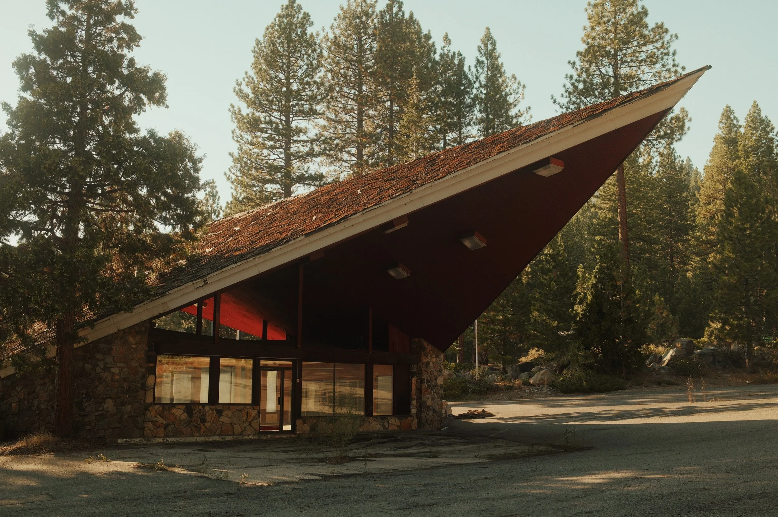 An old gas station in Incline Village, left empty among the trees. Its roof leaned sharply toward the road, unused but striking.