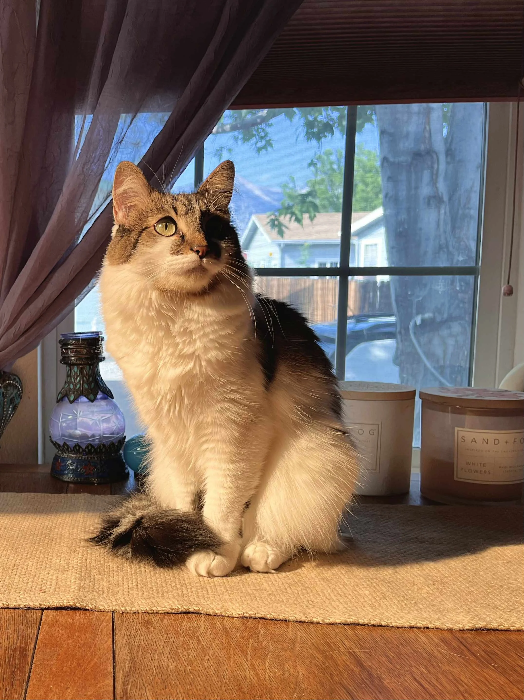 Bowie, our companion for the stay, sitting in the soft glow of the window.